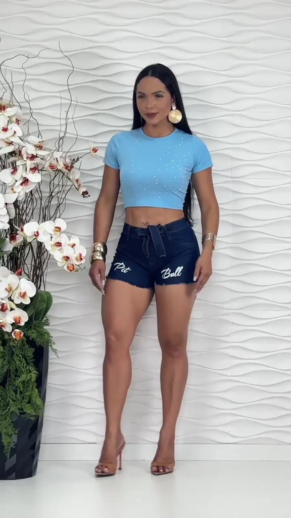 Short Jeans Feminino Cintura Alta Barra Desfiada Com Brilhos 100% Algodâo
